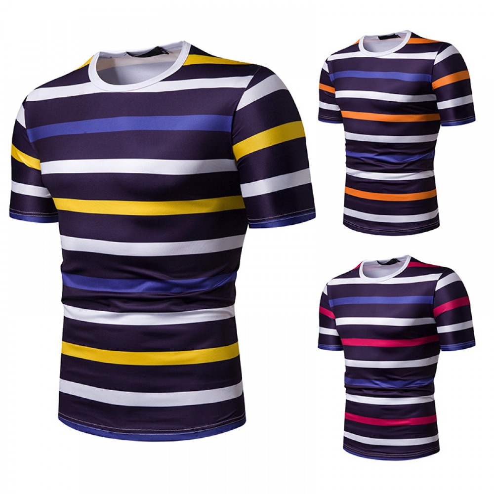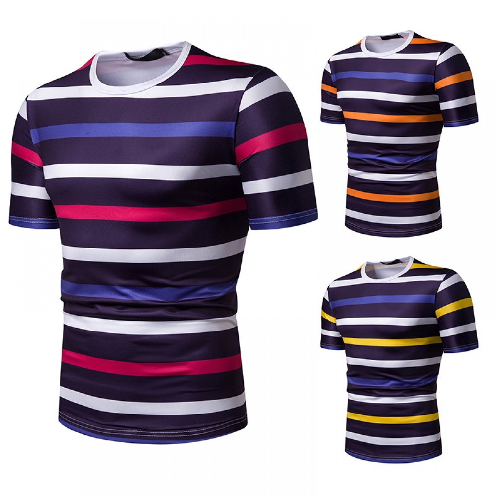 New Summer Men's Short-Sleeved T-Shirt Mens Contrast Striped Slim Casual T-Shirt